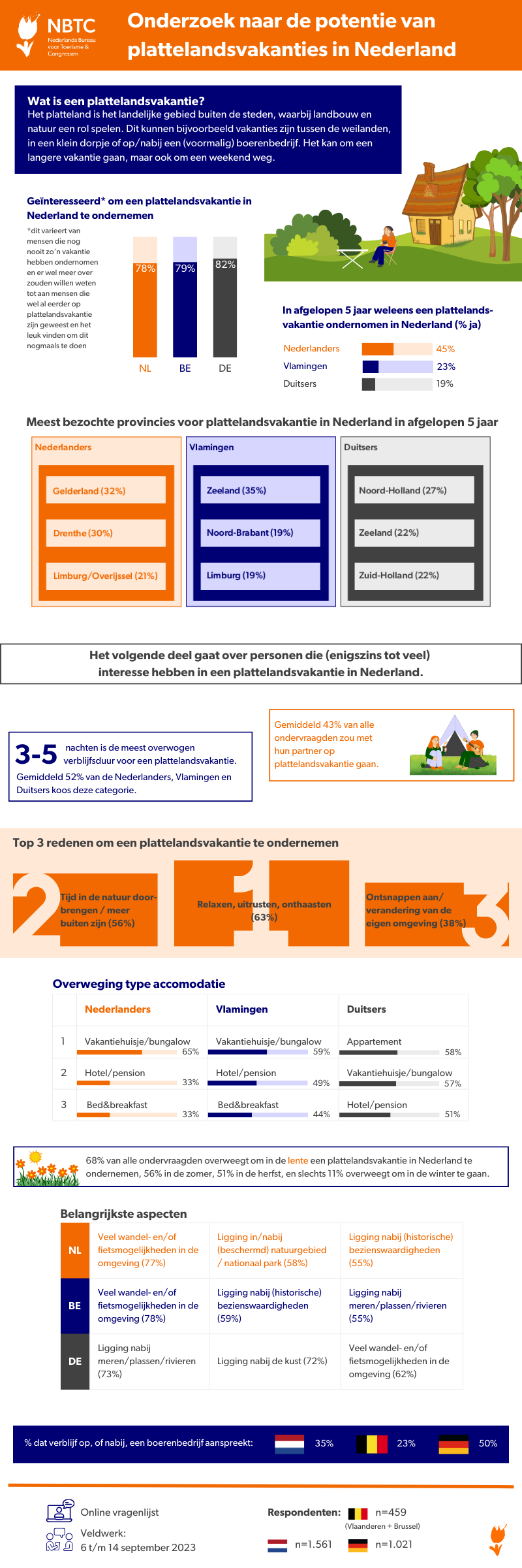 - Bijna de helft van de Nederlanders heeft al eerder een plattelandsvakantie ondernomen in Nederland, bij de Vlamingen en Duitsers is dit circa één op de vijf.