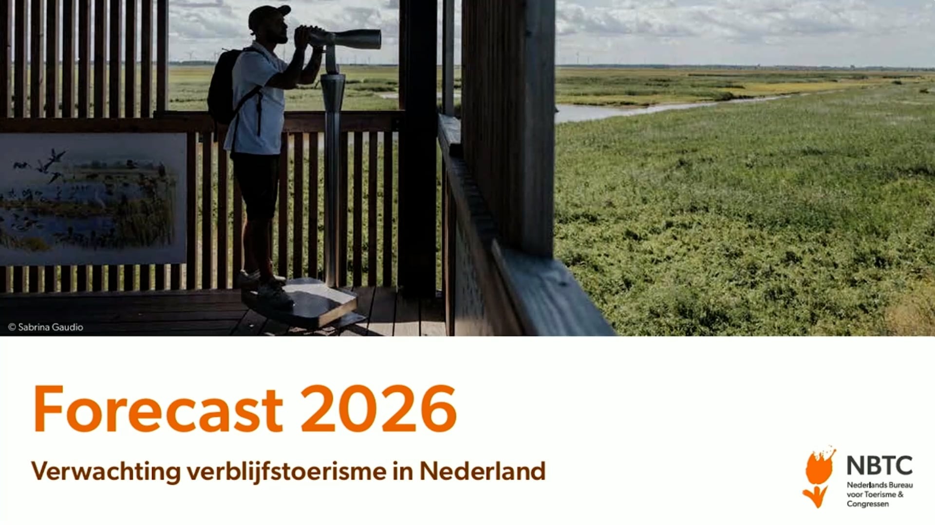 Op 2 februari organiseerde NBTC een online kennissessie over de Forecast 2026: Verwachting verblijfstoerisme in Nederland. Tijdens deze sessie werden de nieuwste inzichten gedeeld over de ontwikkeling van het binnenlands en internationaal verblijfstoerisme door onderzoeksexpert Eelco Snip. De opname van de sessie is nu terug te kijken.